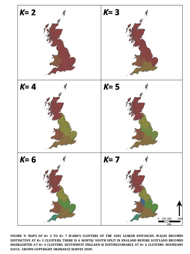 The first k=7 clusters in British names. Very cool! https://www.researchgate.net/publication/39066197_Family_names_as_indicators_of_Britain%27s_changing_regional_geography …pic.twitter.com/P42sAHb9np