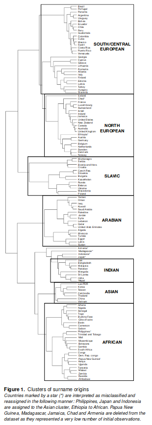 Last names with cluster analysis. Looks strikingly similar to the genetic clusters of the peoples who speak these languages. https://arxiv.org/abs/1804.05015 pic.twitter.com/BoTK9a3hT4