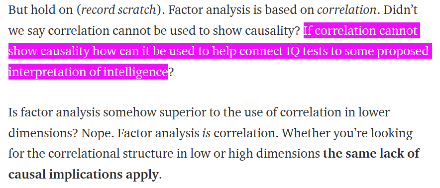This actually is a reasonably interesting critique. The objection is that factor analysis & g doesn't present a mechanistic model of human intelligence that shows us the causality. Which is true! However this doesn't invalidate IQ science.pic.twitter.com/dyyaSsX9ln