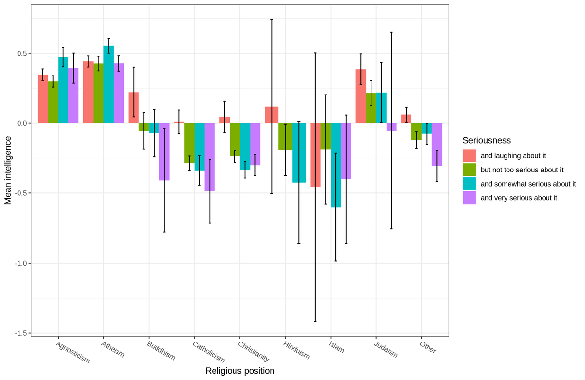 They are, but the profiles did not include Jewish ethnicity. We do examine this because there is a question that asks about "Are you Jewish?" which can mean ethnicity, and we find that atheist Jews are smarter than religious Jews, same as every other group.