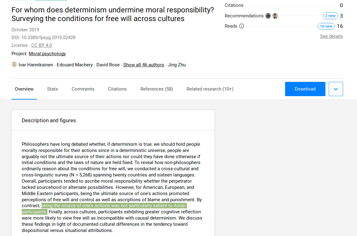 Causality and moral responsibility? Large cross-cultural study shine some light on people's intuitions. https://www.researchgate.net/publication/336577781_For_whom_does_determinism_undermine_moral_responsibility_Surveying_the_conditions_for_free_will_across_cultures …pic.twitter.com/xfdUfnuSJ0