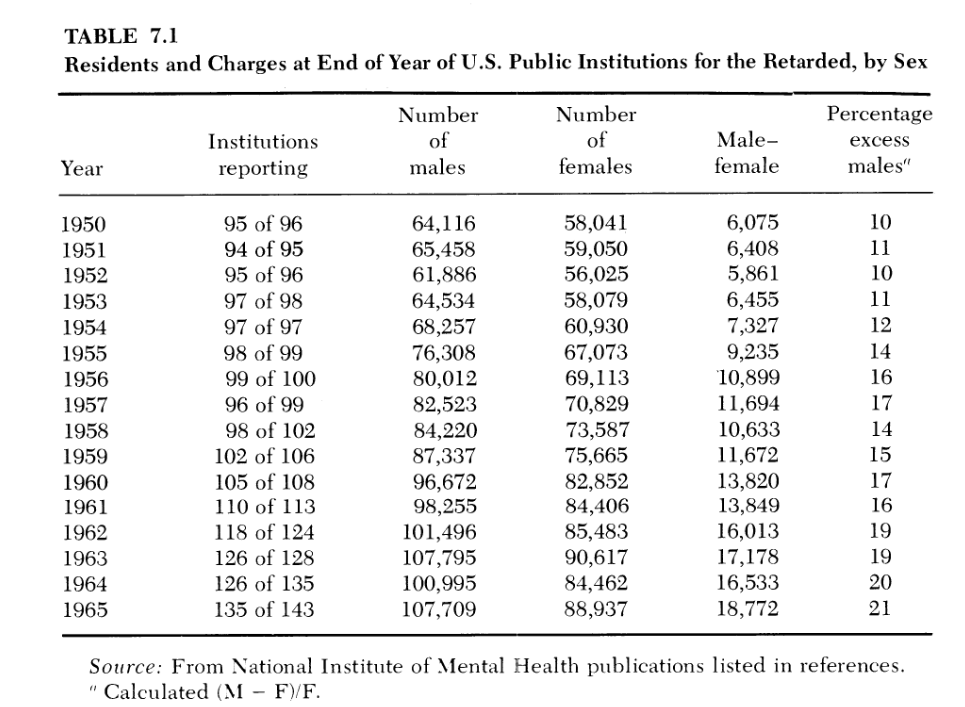 The curious secular increase in male retards seen, is actually an artifact of political changes, namely, the decrease in sterilization and admittance of dull women to control fertility. (There is less need to sterilize the males since few women want to mate with them.)pic.twitter.com/z8kZ47q85l