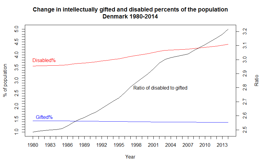 ratio of <70 IQ and >130 IQ in Denmark modeled over 1980-2014. From my paper in draft https://osf.io/dei73/ pic.twitter.com/yWjOOj87AO