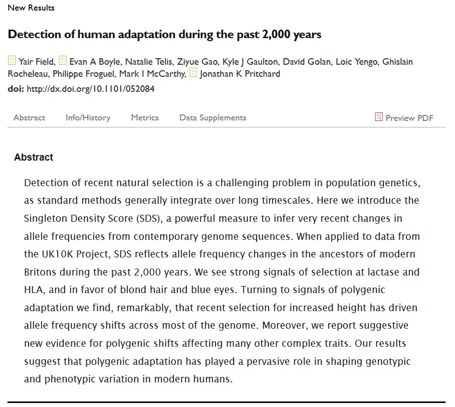 Possibly a game changer. Detection of human adaptation during the past 2,000 years http://biorxiv.org/content/early/2016/05/07/052084 …pic.twitter.com/scxMJB6RXT