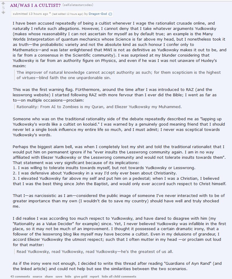 LW people. Definitely not crazy. :p https://www.reddit.com/r/slatestarcodex/comments/6cwsky/amwas_i_a_cultist/ …pic.twitter.com/ZLlQc5ZN8I