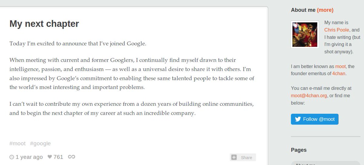 Google fires sex difference guy, but hired moot a year ago. Of all people to hire! http://chrishateswriting.com/post/140641275808/my-next-chapter …pic.twitter.com/gd8F2jNJNp