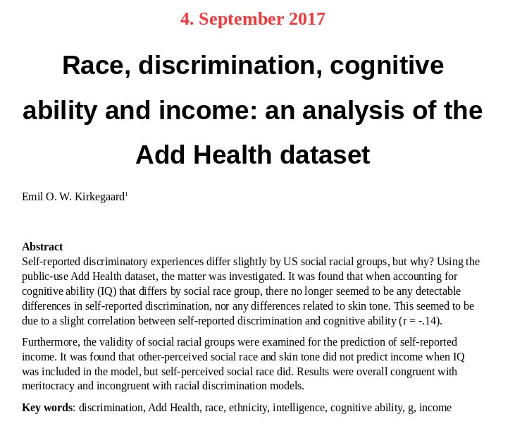 New preprint: Race, discrimination, cognitive ability and income: analysis of the Add Health dataset https://psyarxiv.com/yurbx pic.twitter.com/TkM3e2TuJt