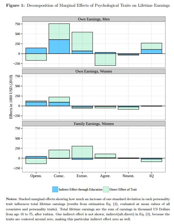 Personality effects on earnings: direct and indirect. Note reverse directions for O! IQ artificially small here bc sample are Termites.pic.twitter.com/OuSFRU1Ie1