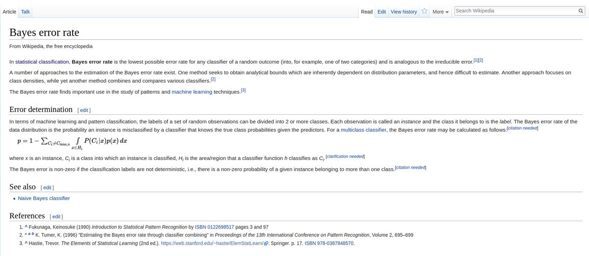 Someone one of the Twitter Bayesians can fix the Wiki page on Bayes error rate? Just needs a few direct refs. https://en.wikipedia.org/wiki/Bayes_error_rate …pic.twitter.com/zPpt2OaKbP