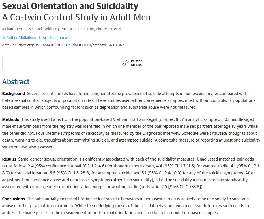 A twin control study for the suicide x homosexuality link. Confirmed in MZ pairs too. https://jamanetwork.com/journals/jamapsychiatry/fullarticle/205355 …pic.twitter.com/MJhyCvcAbr