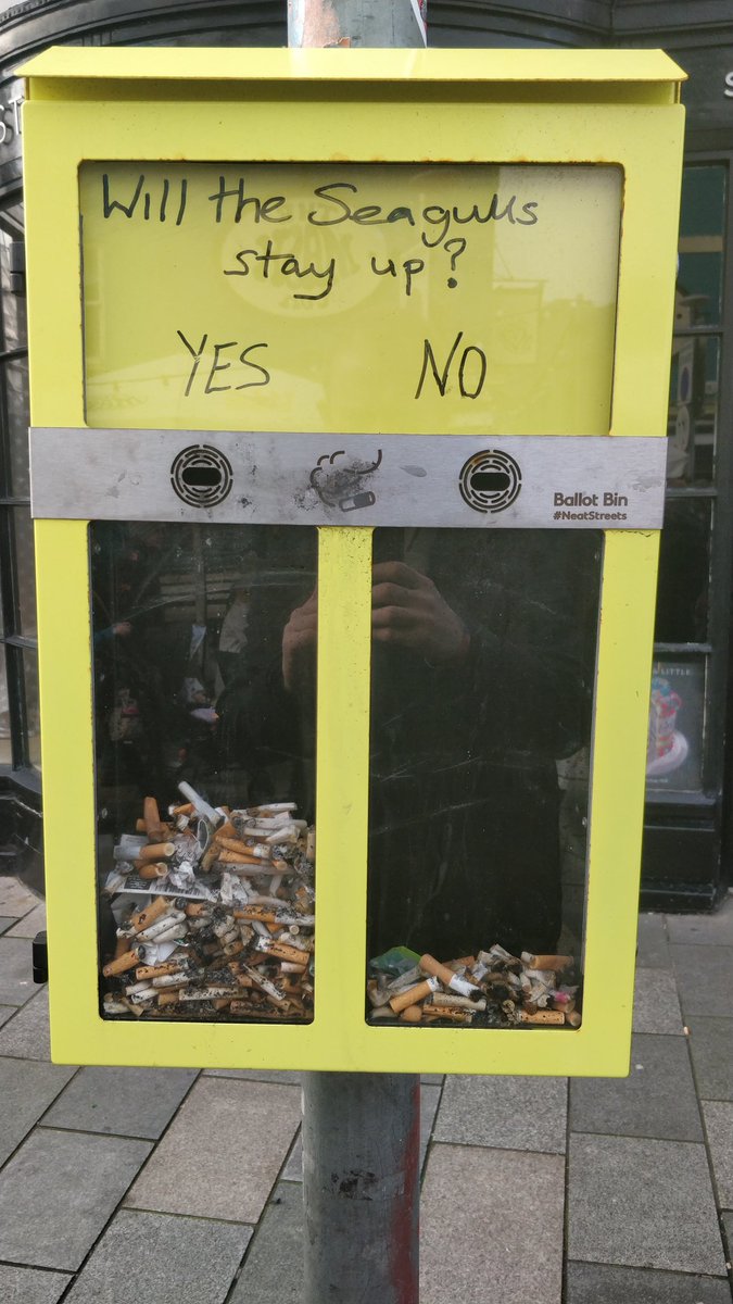 I don't know whether this is gamification/choice architecture/nudging blah blah blah What I do know is that I like this idea *and* there were no cig butts on the floor near this bin. (PS 'The Seagulls' are the local football team)pic.twitter.com/8V5ANcrNqP
