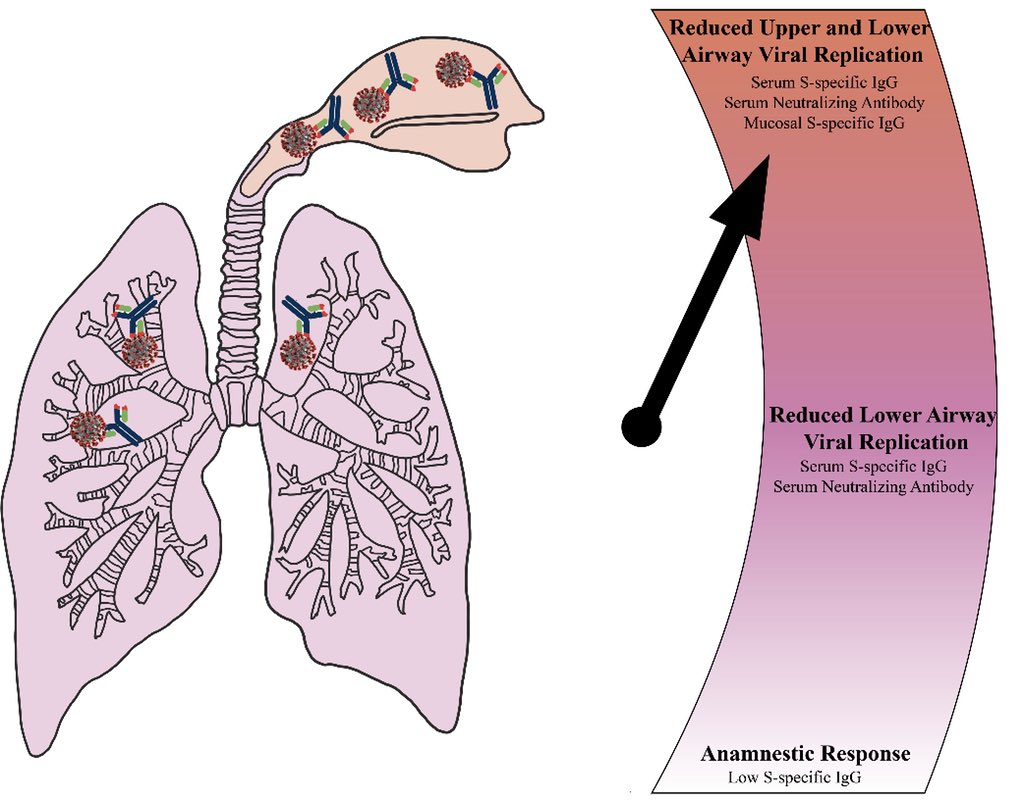 2/n: In this graphic, we show there is a gradient of antibodies that are needed to protect the lung (severe disease) vs the nose (mild disease/transmission). Basically: More antibodies = Better protection, higher up in the respiratory tract As it goes: “It’s level to dis”pic.twitter.com/jZ2lE5HW74