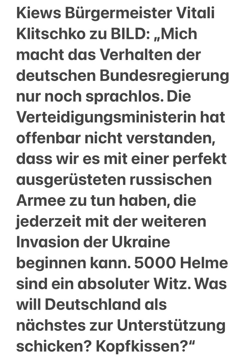 Klitschko: „Wenn die USA und Europa Putin erlauben, die Ukraine anzugreifen, wird er nicht vor der Ukraine Halt machen. (…) Und wenn er von seinem Wunsch spricht, das Sowjetimperium zurückzugeben, dann schließt das auch die ehemalige DDR ein.“https://www.bild.de/politik/ausland/politik-ausland/russen-nennen-verhandlungen-mit-den-usa-erfolglos-droht-ein-krieg-in-der-ukraine-78819540.bild.html …