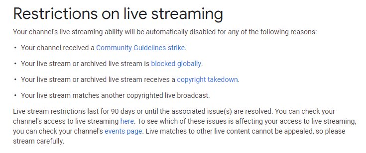 Live stream restrictions last for 90 days or until the associated issue(s) are resolved. To see which of these issues is affecting your access to live streaming, check your channel's events page. Live matches to other live content cannot be appealed, so please stream carefully.