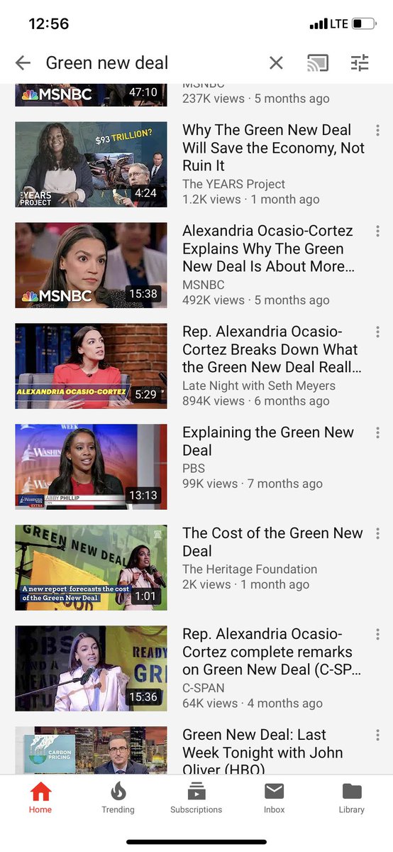 Oh, now I see it: While adding “crowder” to the search pulls his up directly, only searching for “Green new deal” shows none of his videos. At all. After scrolling for a solid minute. So much for reading the bill straight through. :/