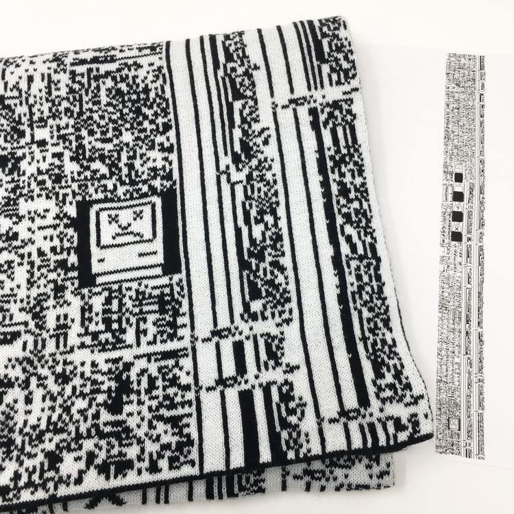 Happy Mac / Sad Mac scarves back in stock: vintage Mac ROM from a Power Mac 5200 knit into a scarf. The ROM has hardcoded images in it. Comes with code by
