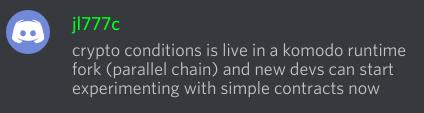 More info about Crypto-Conditions:https://komodoworld.blog/2018/07/17/9-crypto-conditions-reading-list/ …