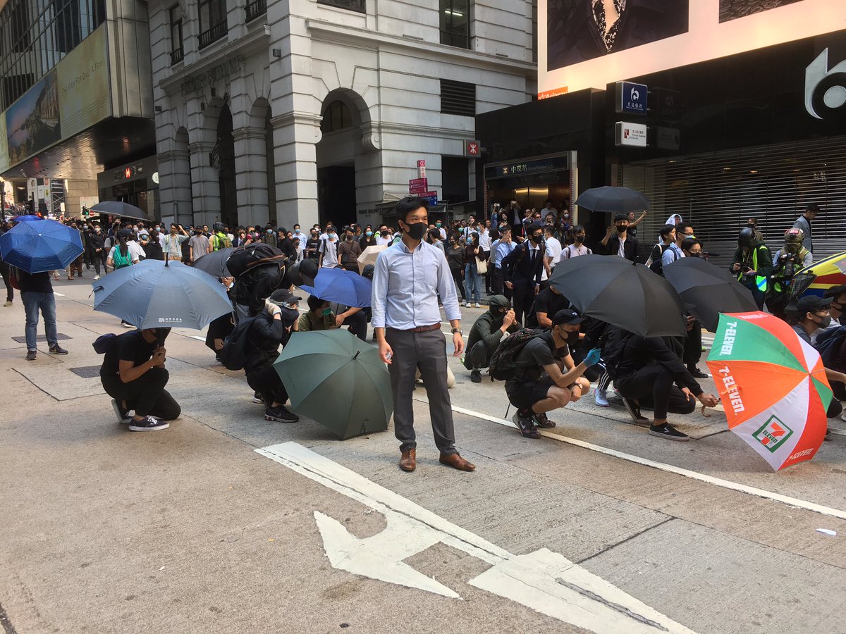 Looking up Pedder St now from Connaught Rd- protesters as far as the eye can see. It’s beautiful: office workers, young people, all kinds of ordinary citizens have just stood down the police. They may not attack us again until evening.pic.twitter.com/gPBkTorB10