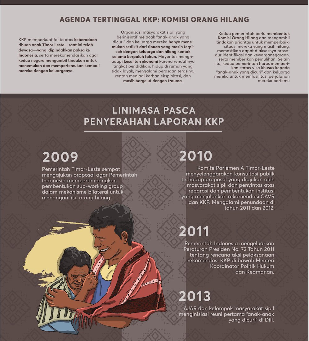 10 tahun yang lalu Komisi Kebenaran & Persahabatan (KKP) Indonesia & Timor-Leste menyerahkan laporan akhir, “Melalui Kenangan Menuju Harapan.” Tetapi ada janji yang “hilang”: prioritas kedua negara untuk membentuk komisi orang hilang dari masa konflik.