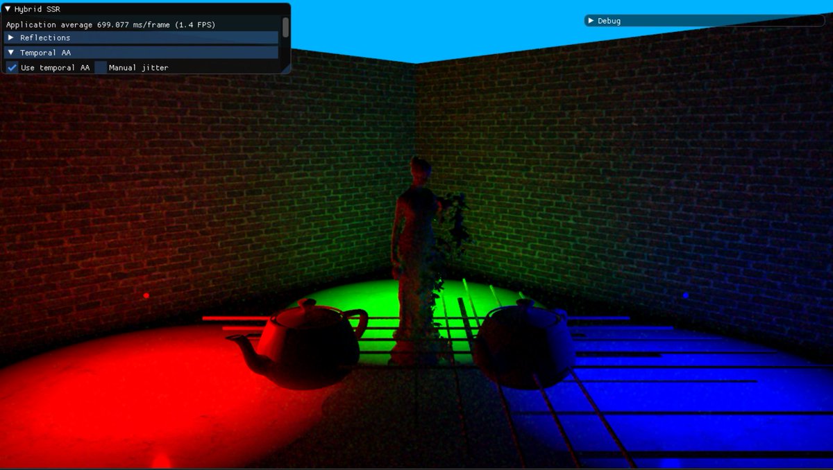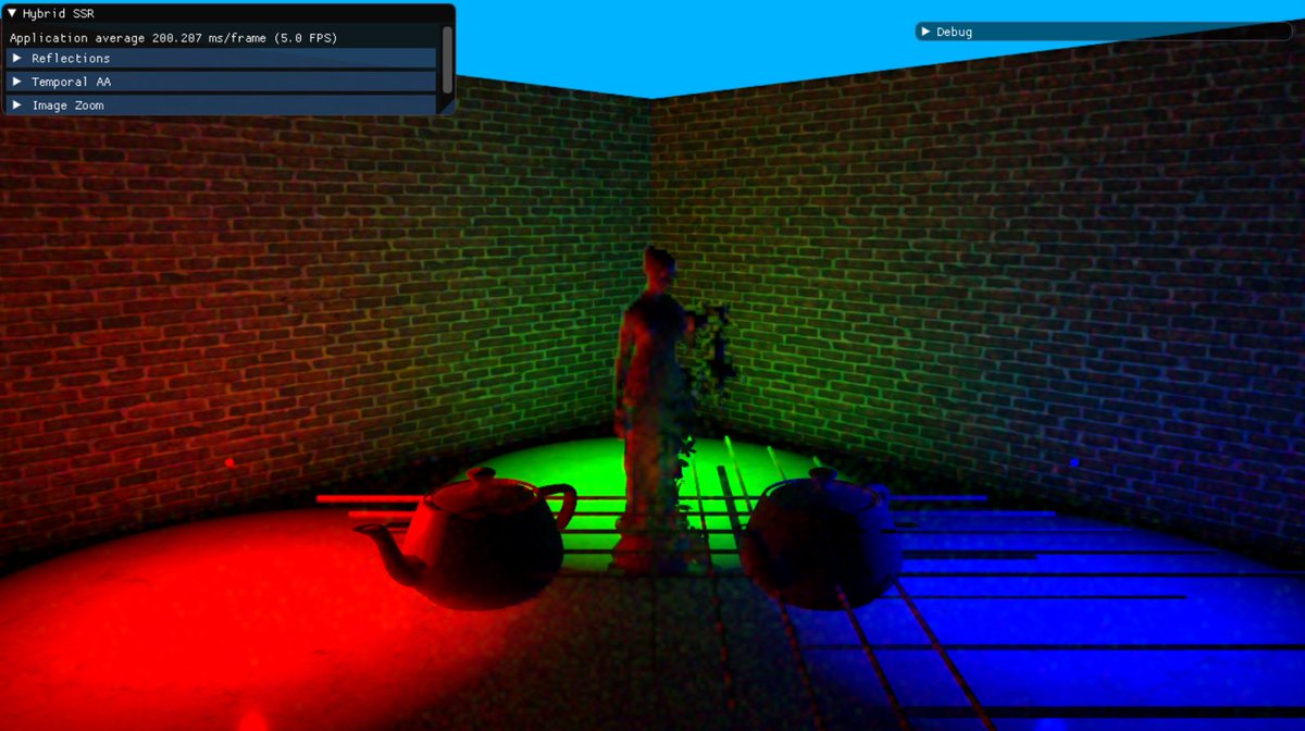 Testing raytraced GI after adding support for a structured buffer BVH. With such a big GPU load, power saving soon kicks in on the laptop and kills performance in the end. Using some temporal antialiasing the GI converges nicely though.pic.twitter.com/vWosmTnXbL