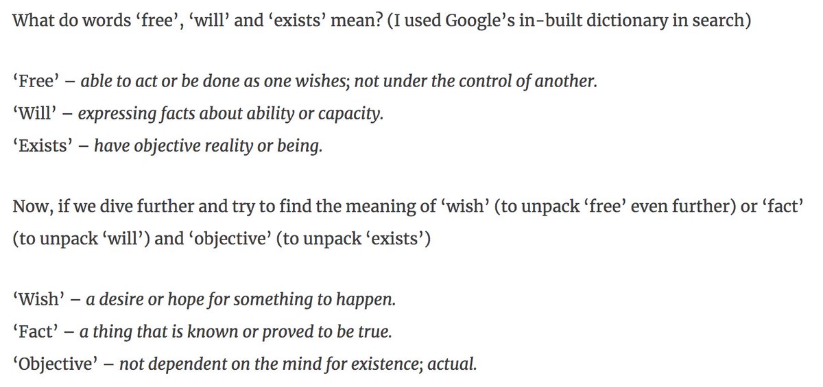 11/ Let’s come back to the question of free will and whether it exists. It sounds embarrassingly simple but if you unpack individual words, you’ll quickly realize that the question is nonsense or underwhelming.pic.twitter.com/WK0vBL1Jjb