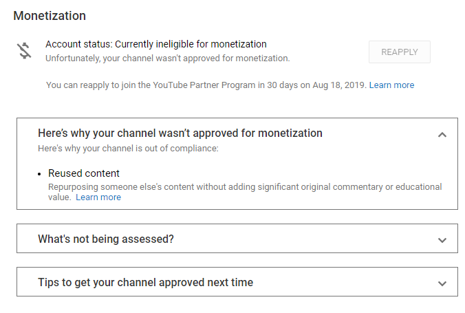 Just found out that YouTube won't let me run ads on stream VOD's I OWN due to "Reused Content". I literally have to wait another 30 more days to have the privilege to ask them to automatically decline me again. Hey @TeamYouTube, please help me. Thanks.pic.twitter.com/CiWfDKnJVY