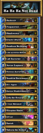 I've been trying, tweaking and refining various quest rogue builds over the last couple of days at high legend. Ultimately, this one felt the strongest. Inspired from watching @HSPurple 's stream a week ago before the nerfs. Now there is room w/o gigglings for removal package.pic.twitter.com/a2a1hJdLny