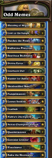 Here's some Wild Decks I've been playing the last couple of days: (1) Reno Priest w/Nexus-Champion Saraad (one of my all time favorite cards), and (2) Odd Pally with inspire cards...cuz normal odd is kinda boring, no offense.pic.twitter.com/iFFSUQAt9m