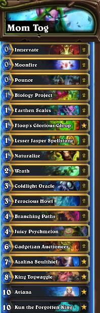 Fell out of top 100 the last couple of days, but tweaked my strategy and got back to top 50 Legend in Wild. Basically, my core deck is @CONCERNEDMOMHS Togwaggle Druid, but I have a counter version for the Kingsbane matchup when players switch on me (double ooze and Floop).pic.twitter.com/FCcI7Zbvyr
