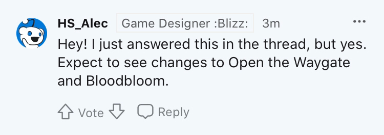 I can't overstate how huge this is: balance adjustments incoming to two of the most challenging (read: broken) cards in the #WildHS format. Major props to Blizzard for listening & making it clear that they are going to take action. #Hearthstone #AshesOfOutlandpic.twitter.com/DMvXZafF08