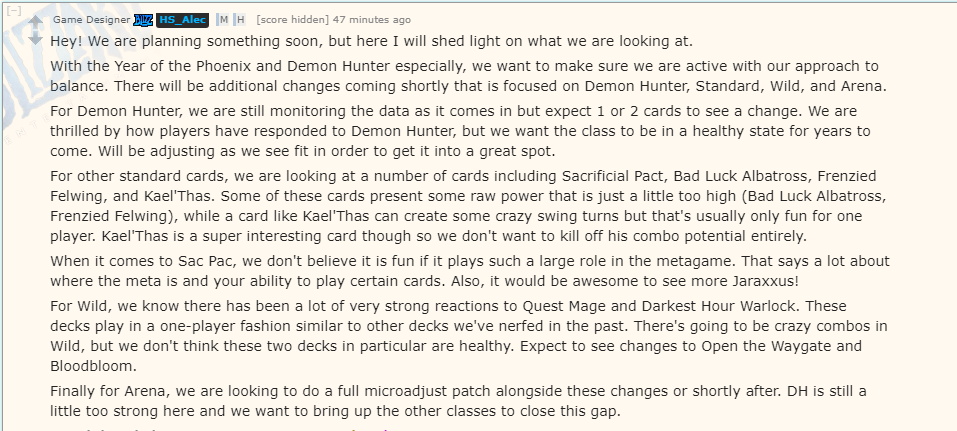 Changes coming for several different areas of Hearthstone! Been seeing a lot of passion for Wild and Arena in particular over the last few days, and that's awesome! We want to foster even more of that passion and excitement. 1/?pic.twitter.com/C5QiIZs60W