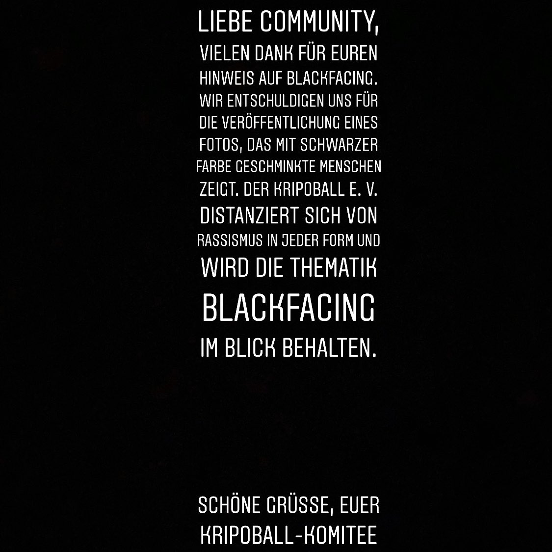 Nice try. Ihr habt also das Wort "Hautfarbe" verändert. Noch einmal die Frage: Versteht ihr, warum man sich nicht von Rassismus "distanzieren" kann. Und was heißt das "die Thematik Blackfacing im Blick behalten"? Was sind die konkreten Maßnahmen?