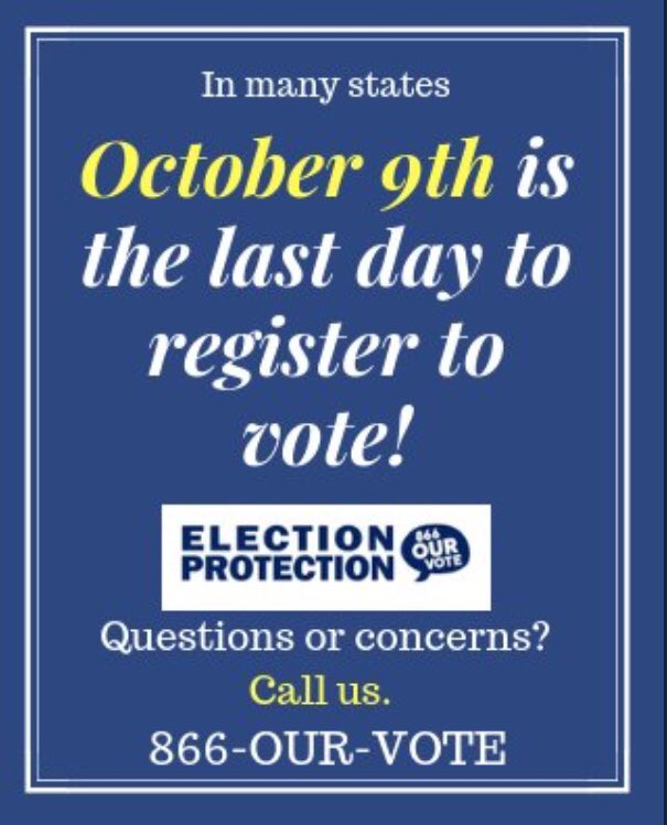 Tuesday, October 9th is the voter registration deadline in 1/3 of states— AZ, AR, FL, GA, IN, KY, LA, MI, MS, NM, NV, OH, PA, TN, TX. Are you registered and ready for