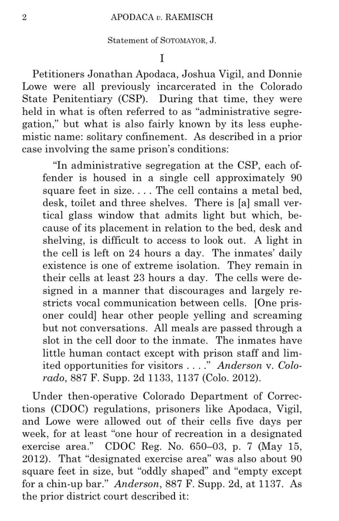 A set of solitary confinement in prison cases were up at the Supreme Court for review but the Court denied cert. Both Kennedy and Breyer seemed to invite cases on the issue earlier. As Sotomayor notes, prisoners in near-total isolation comes “perilously close to a penal tomb.”pic.twitter.com/IYboxf3kKy