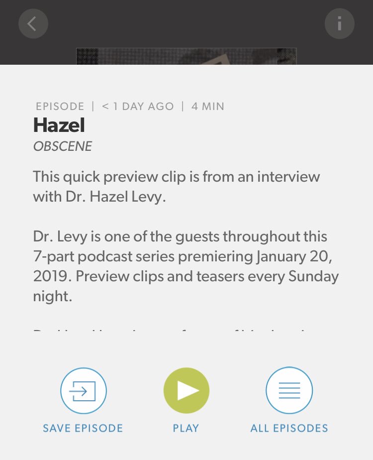 1/ Hello everyone! Here's another teaser from my podcast: Obscene. Meet one of this season's guests: Dr. Hazel Levy. Teasers every Sunday evening until the season officially premieres January 20, 2019. Subscribe here: iTunes 🎙️📻 https://itunes.apple.com/us/podcast/obscene/id1441658559 …… pic.twitter.com/OI5i3BLKZJ