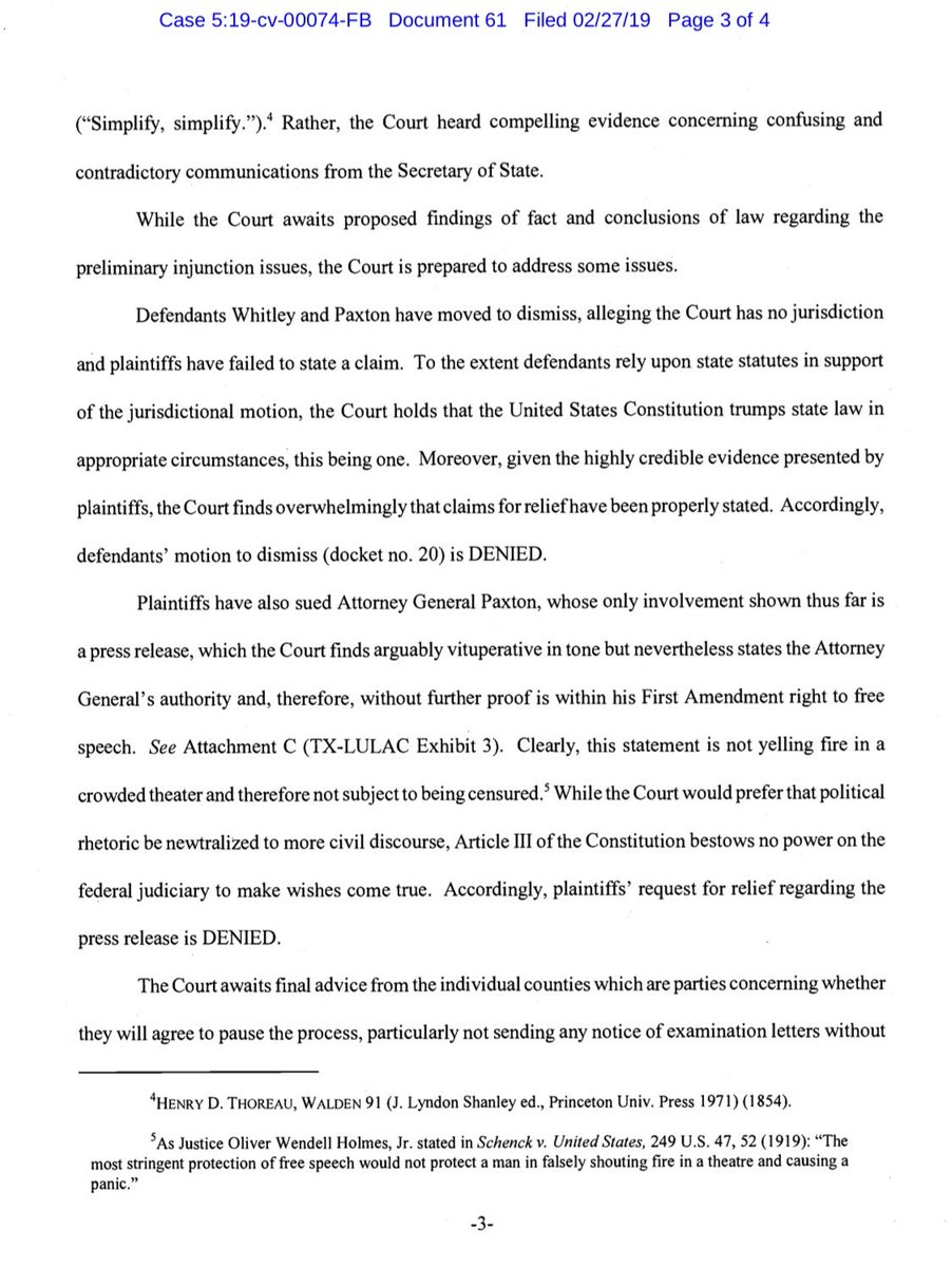 Powerful lines from the TX court: -"there is no widespread vote fraud" -This scheme "exemplifies the power of government to strike fear and anxiety and to intimidate the least powerful among us." -"Almost immediately after sending the list, the government had an "oops" moment.."