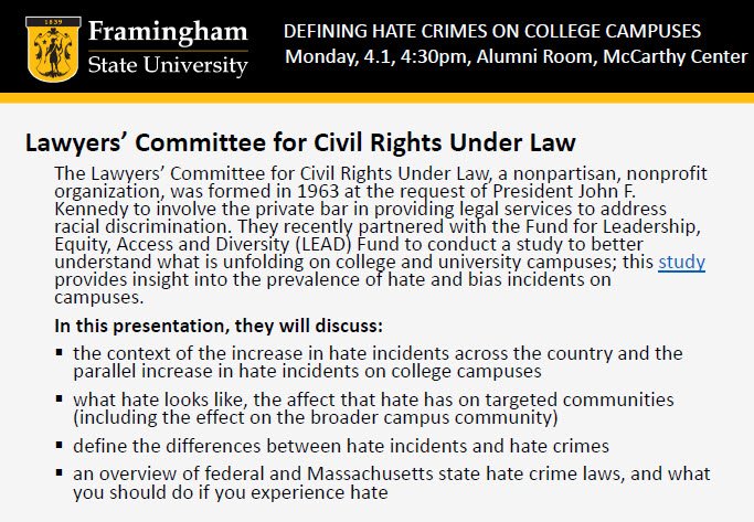 We're looking forward to visiting @FraminghamU next Monday, April 1st at 4:30PM for a hate crime training, "Defining Hate on College Campuses." We'll be joined by @LCRBOSTON & will cover federal/state hate crime laws, hate on college campuses, & ways you can combat hate. Join us! pic.twitter.com/jBjfrkLJEa