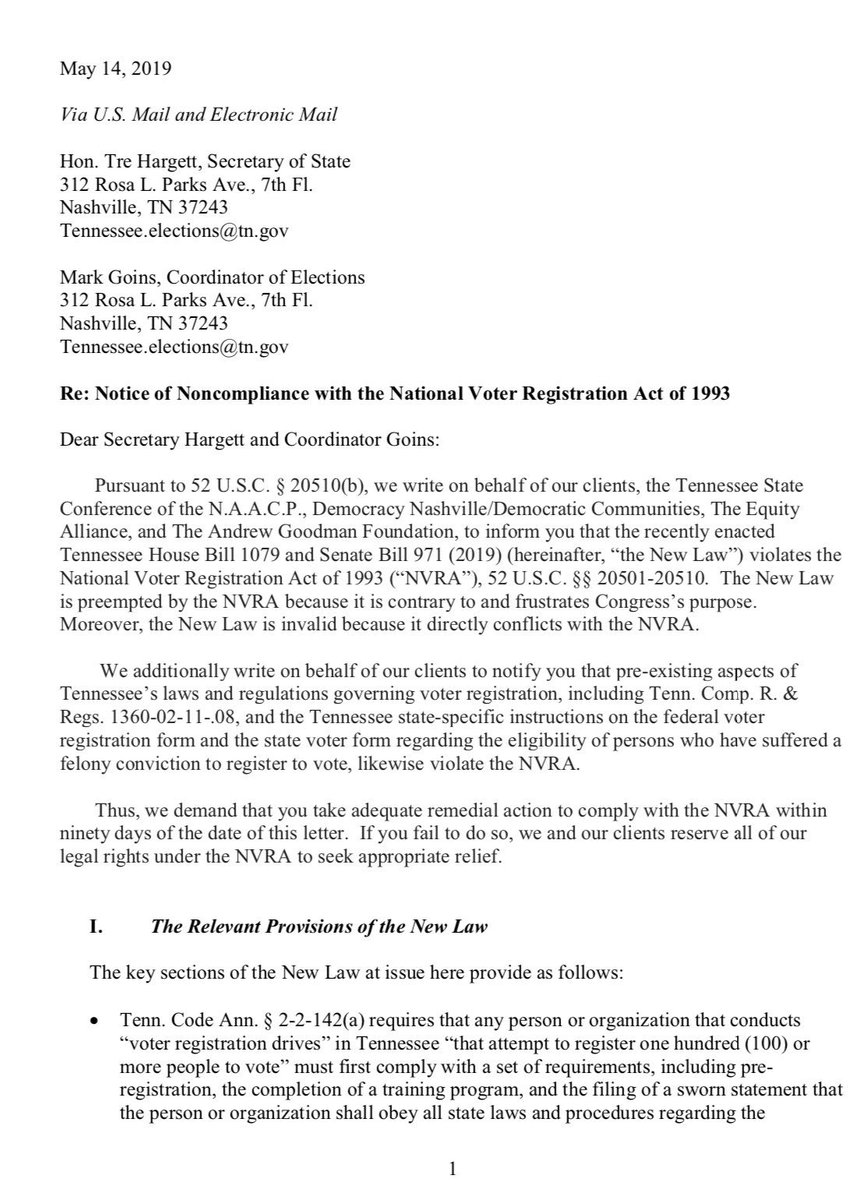 ALERT: We’re using every tool in our arsenal to beat back a draconian #VoterSuppression scheme in Tennessee. In addition to our lawsuit, we are giving state officials notice that their law violates the Nat’l Voter Registration Act. @LawyersComm We will always stand up for voterspic.twitter.com/LayWrWyUL0