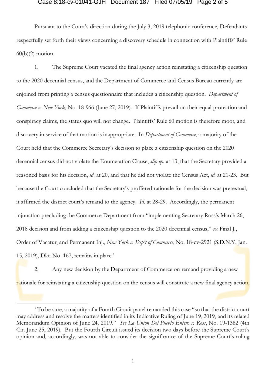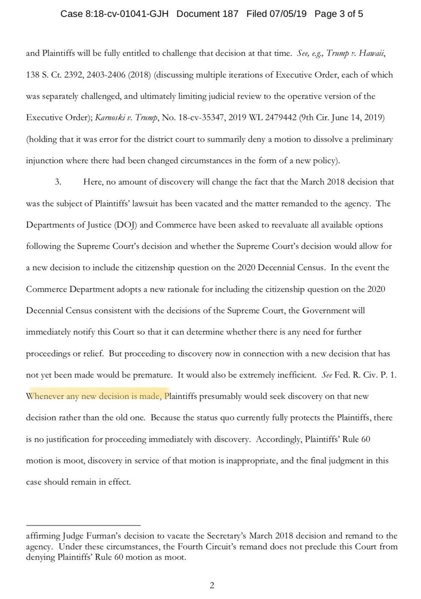 NEW: MD court issues order allowing discovery to proceed. This means that as the gov’t lawyers devise a “new” rationale for the citizenship question, judge will allow discovery (depos, doc. requests, etc) on the discriminatory motive underlying the administration’s motive to datepic.twitter.com/1j1YJ7OPlf