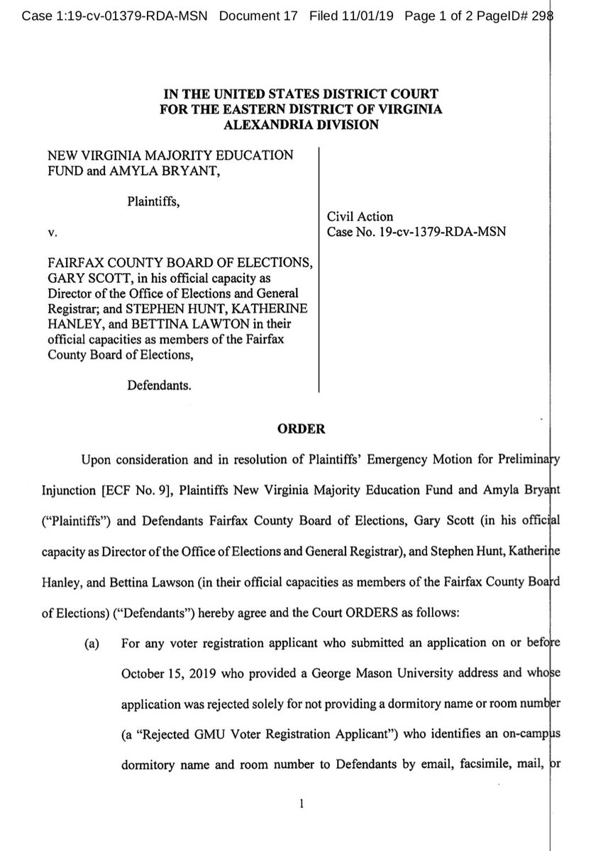 BREAKING: We just secured a settlement in our case that ensures students at George Mason Univ. whose registration applications were rejected will get to vote on 11/5 and have their votes counted! We’ll keep using the courts to fight #VoterSuppression across the US. @LawyersCommpic.twitter.com/KSef45IZHZ