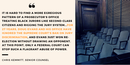 Serving on a jury is a fundamental right and critical to democracy. Doug Evans has ignored the fact that striking jurors based on race is unconstitutional. Read our full statement: http://bit.ly/2r37KIV  pic.twitter.com/UuYsLPpu0V