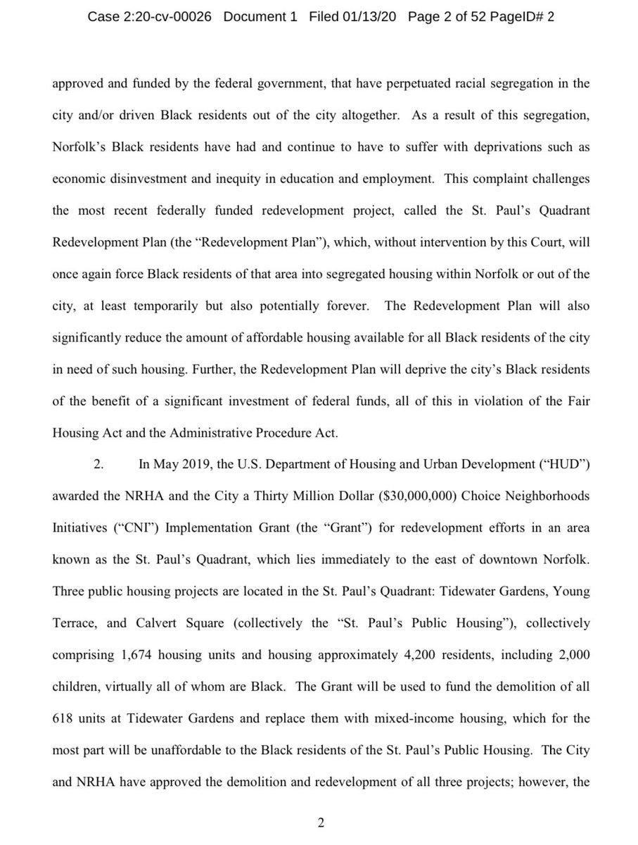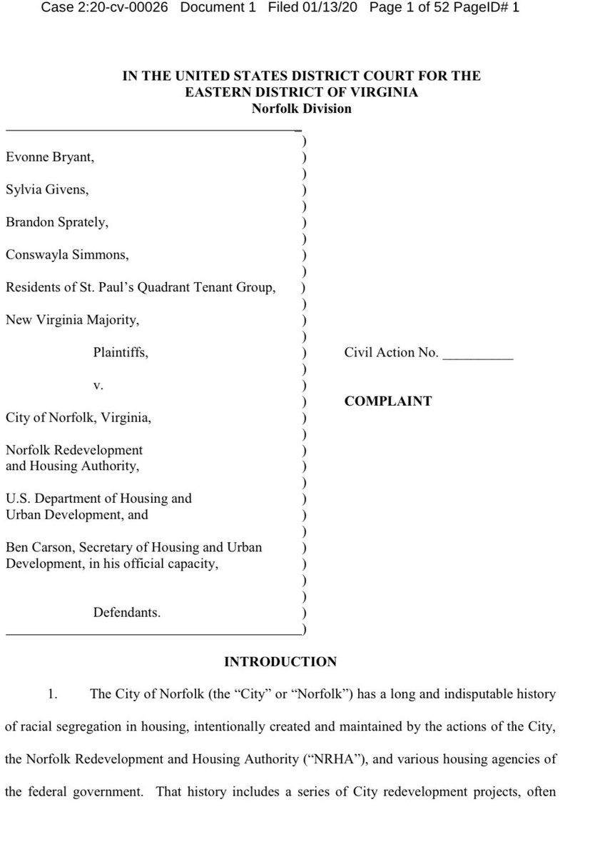 BREAKING: We just filed a fair housing lawsuit in Norfolk Virginia where a new redevelopment plan stands to drive residents out of several public housing complexes, almost all of them Black and poor. This is a textbook example of gentrification. We’re fighting back! @LawyersCommpic.twitter.com/QlFOjPYhE9