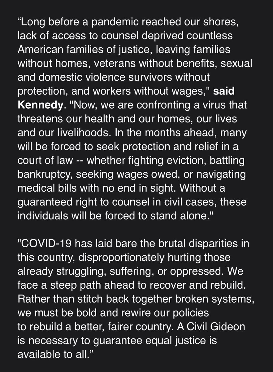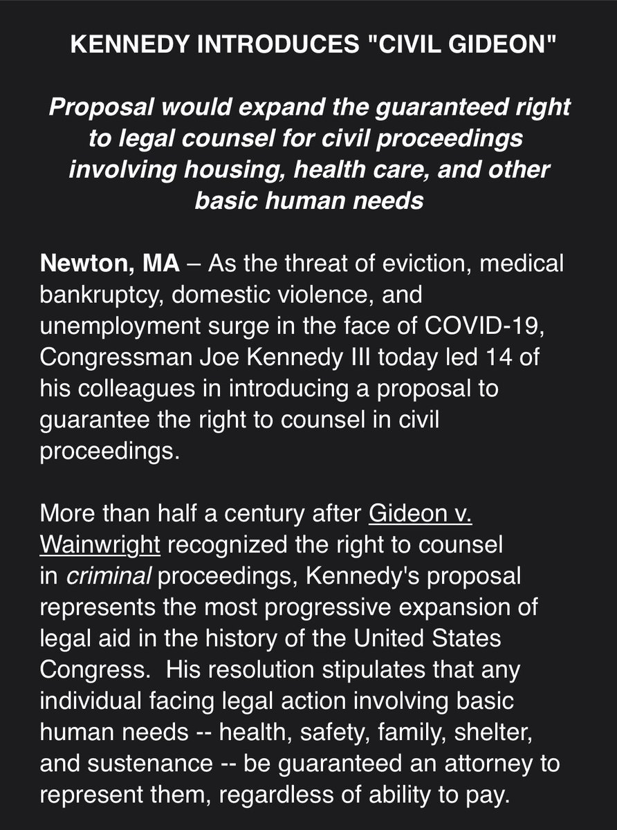I support @RepJoeKennedy’s call for access to counsel in civil proceedings. #CivilGideon In 2019, 94M Americans could not afford a lawyer. Three quarters of low-income households experienced a civil legal problem involving DV, evictions, housing, health care & more. #Covid_19pic.twitter.com/h5yDmAki1t