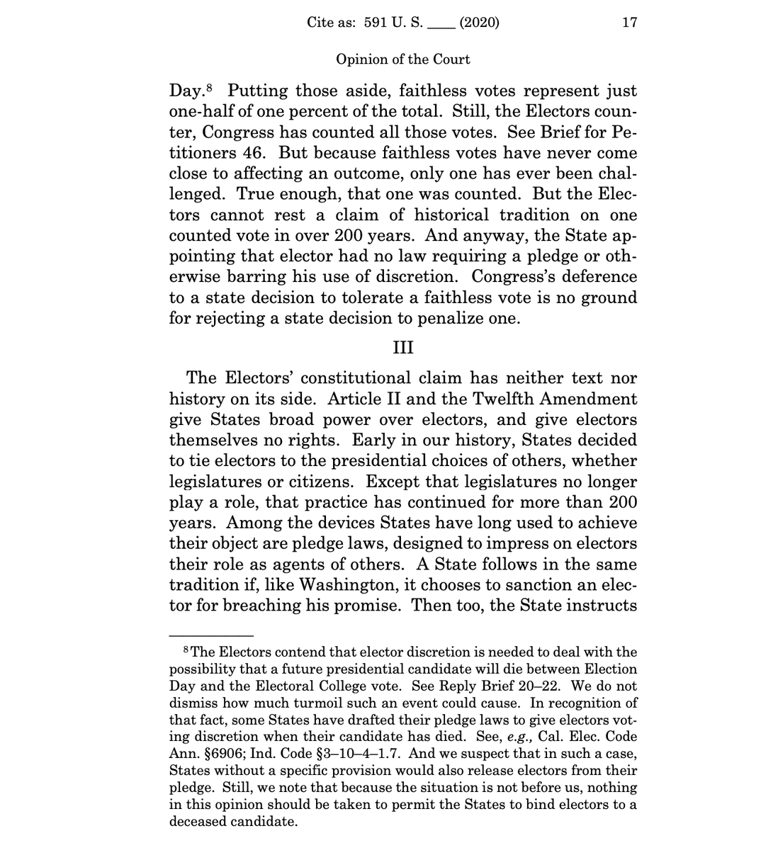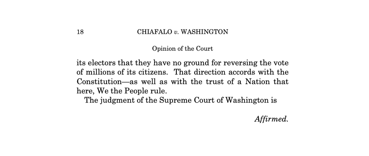 Supreme Court rules that “faithless elector” laws, which allow states to remove or fine Electoral College delegates who don't vote for the candidate they were pledged to support are constitutional. This ruling is a reminder about the need to reform the Electoral College.pic.twitter.com/wYAEGV1VEz