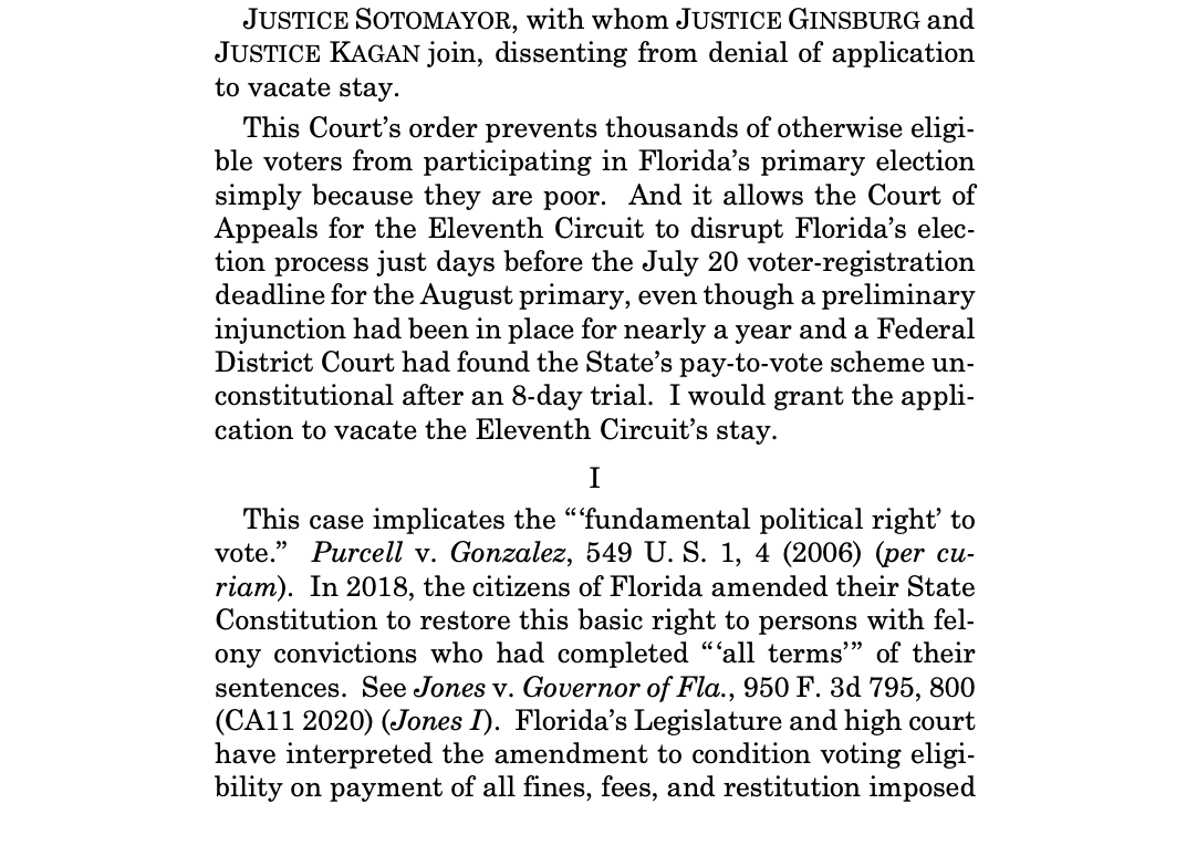 NEW- The Supreme Court failed to lift a federal appeals court's order that blocks some Floridians with criminal histories from voting in an upcoming primary. Justice Sotomayor observes in her dissent that this will BLOCK thousands of eligible voters from voting.pic.twitter.com/uUSewPLrIT