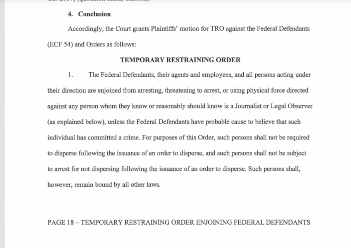 Federal court blocks Trump's secret federal army from using force or threats of arrest against journalists and legal observers in Portland.pic.twitter.com/iyFi9rquL3
