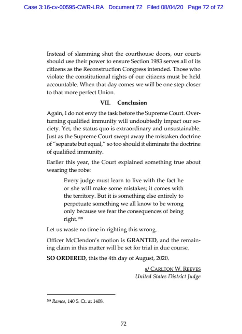 Read Judge Carlton Reeves’s full opinion on the qualified immunity doctrine and the way it binds judges who seek to ensure justice here —>https://www.documentcloud.org/documents/7013933-Jamison-v-McClendon.html …