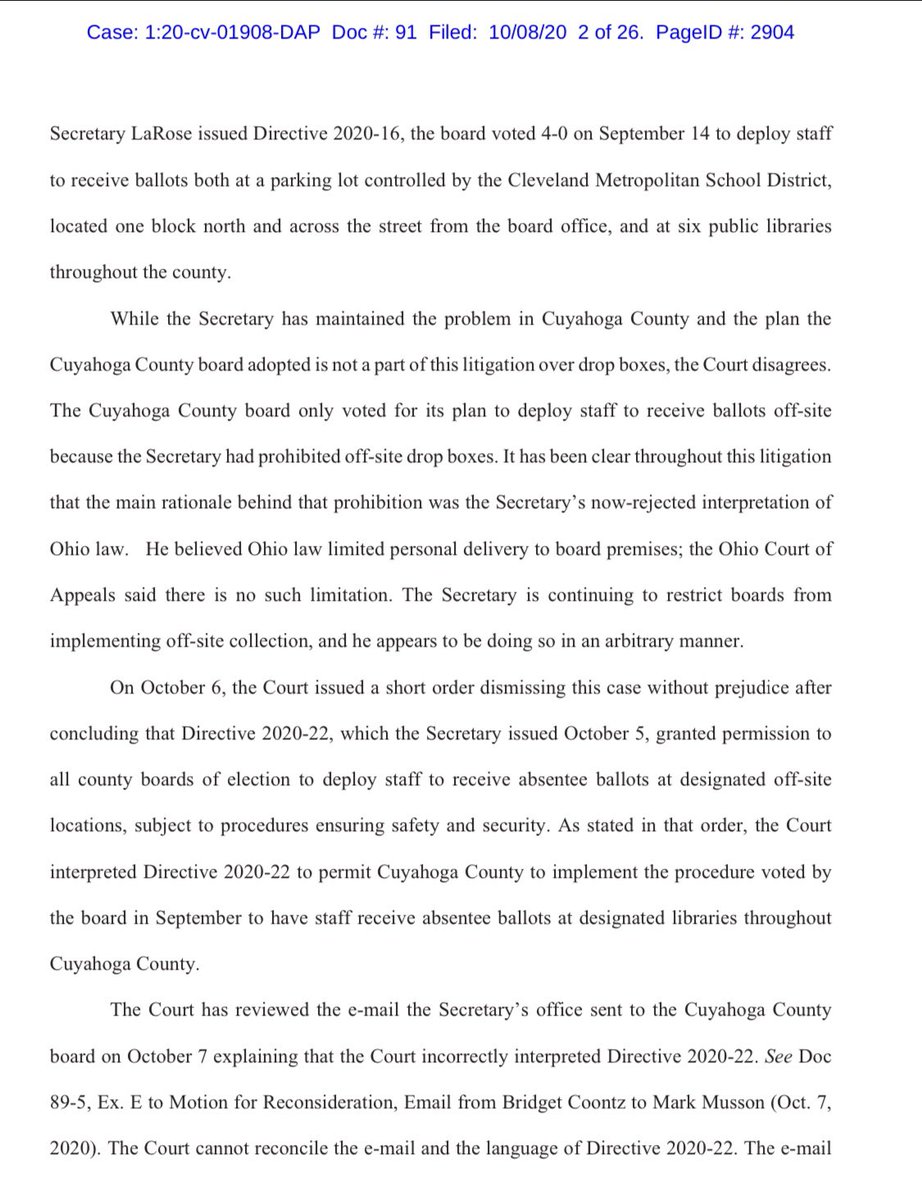 Powerful finding by the court regarding the disparate impact--> "While it may be said that the 7,903 registered voters in Noble Cty may find a single drop box location sufficient, the record demonstrates that the 858,041 registered voters in Cuyahoga Cty will likely not."