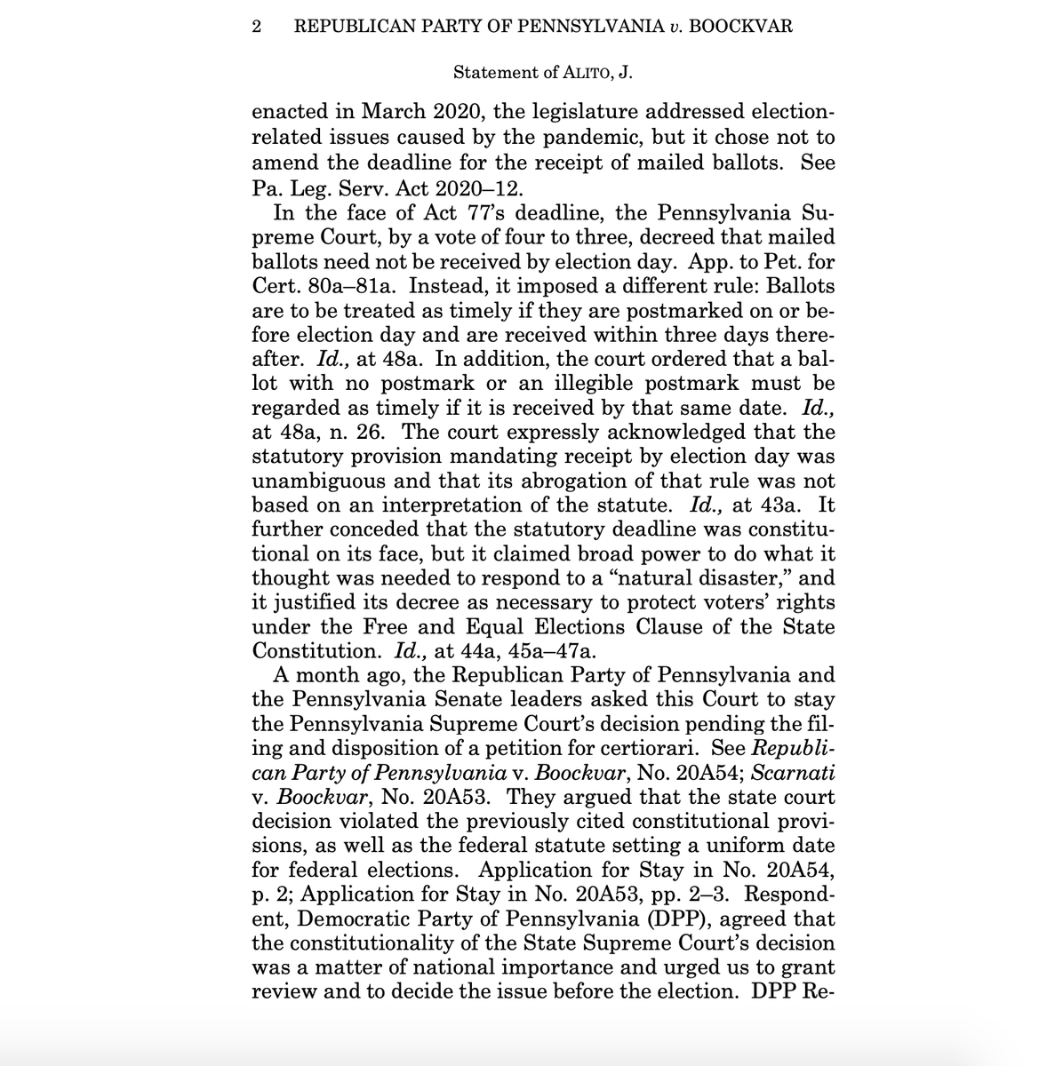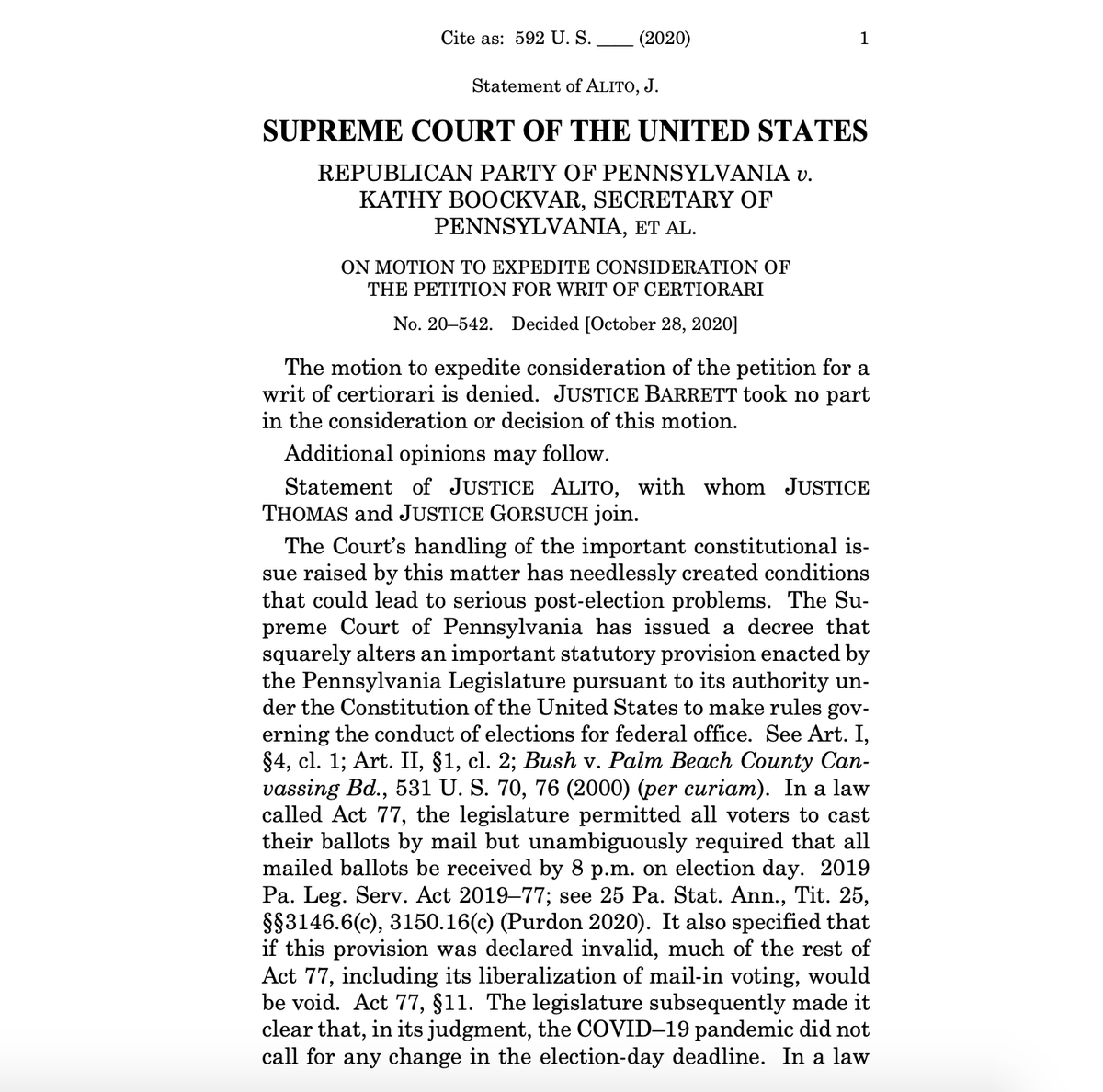 BREAKING: Supreme Court REJECTS Pennsylvania operatives desperate, second attempt to block the extended deadline for receipt of absentee ballots. Most significantly, Justice Barrett took *no* part in the decision. This is an important win for voters in PA and for democracy!pic.twitter.com/FczYxr0dIo