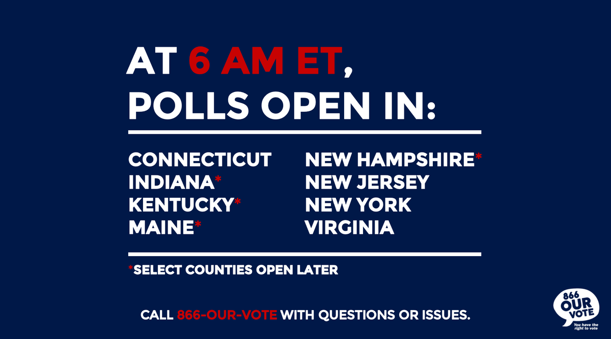 Polls open at 6 AM in CT, IN, KY, ME, NH, NJ, NY, and VA.